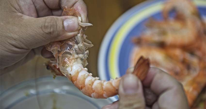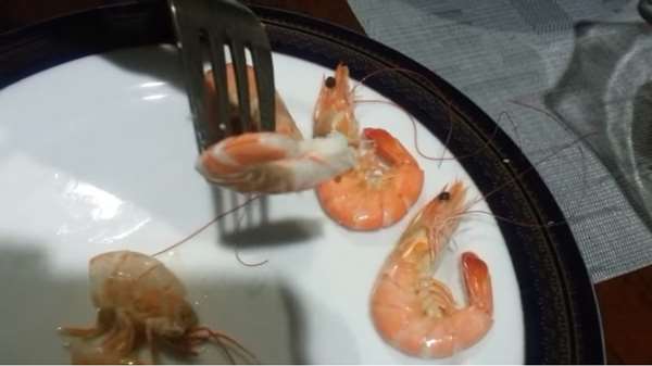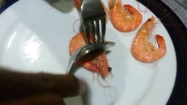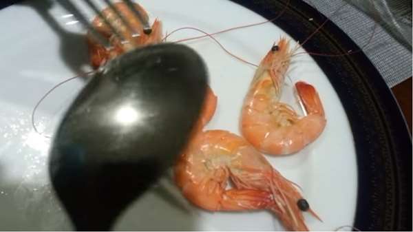 再來,使用湯匙從蝦腳部位拉扯,讓蝦殼脫離。最後,用湯匙按住蝦尾,使用叉子把蝦肉拉出,就大功告成了!