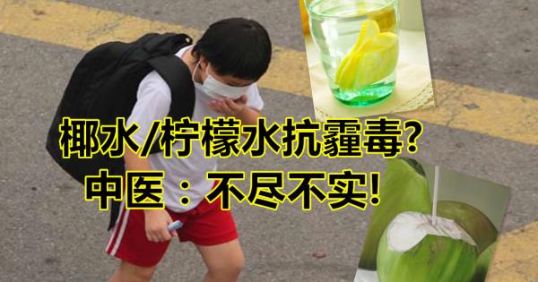 注意:每逢天災人禍發生之際,總有各類似真似假的訊息在四處流傳,就如本次煙霾再起,相關的訊息就四處流竄,內容的真實度都有待商榷。所以,在收到有關訊息時,就不急著轉發或轉寄,應當要求證相關專業人士,再作定奪。比如訊息中所指的椰水和檸檬水都不是不良飲品,但不是每個人多喝這類飲品都會沒事。所以在煙霾嚴重期間,希望大家都能多加留意家中親人的身體狀況,若有不適,儘早求醫為佳。