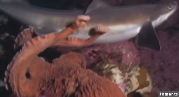 但是當這隻鯊魚遊來,毫無防備的它瞬間被長長的觸手抓住!原來是只章魚躲在暗處,趁機抓住了鯊魚。章魚用它的腳纏繞鯊魚,雖然鯊魚也反抗咬了好幾次,但還是敵不過章魚腿的數量,最後力氣用盡放棄了掙紮。