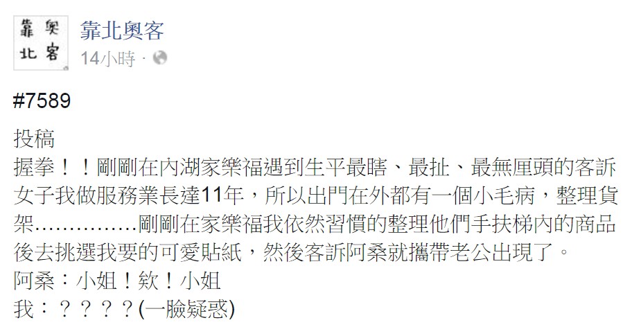 這應該是服務業做久的一種職業病吧XD 我自己出門在外也是常常會幫忙整理一下亂掉的貨架, 或幫忙排整齊, 但還沒那麼倒楣遇到這種瘋子的...... 整個就很有事= =" ----------------------------------------- 靠北奧客原文: #7589 握拳!!剛剛在內湖家樂福遇到生平最瞎、最扯、最無厘頭的客訴, 小女子我做服務業長達11年,所以出門在外都有一個小毛病,整理貨架…………… 剛剛在家樂福我依然習慣的整理他們手扶梯內的商品,然後去挑選我要的可愛貼紙,然後客訴阿桑就攜帶老公出現了。 阿桑:小姐!欸!小姐 我:????(一臉疑惑) 阿桑:這個東西在哪???!!!!! 我:(燦笑)我不是店員耶~ 阿桑:騙人!!!我剛剛有看到你在整理東西,你是店員!!! 我:我是客人………(羊角角已冒出) 阿桑:少來!!!客人是不會整理東西的,你就算休假穿便服也要幫我找東西!!!! 我:(羊角角完全露出要炮人了) 好阿!!!!客訴啊!!!要我幫你要叫樓管還是區經理,誰說客人不會整理東西的!!!!就是有你這種腦漿流的滿地的澳洲移民,服務業才越來越難做!!!我是顧客不是員工!!! 阿桑:我我我我我一定要去客訴你這個愛狡辯的員工!!! 我:慢走不送(繼續挑貼紙) 誰說客人不能順手整理東西的? 誰說客人不能順手整理東西的? 誰說客人不能順手整理東西的? 到底???? --------------------------------- 小小心得: 就算真是店員,非上班時間,也沒必要服務你吧? 這社會是怎麼了?= =