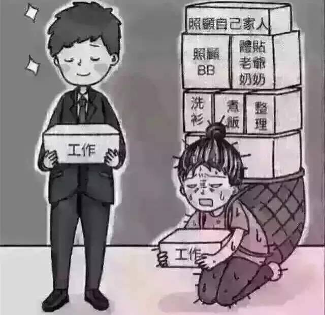 而對比旁邊的女人,捧著「工作」,卻被身後沉重的負擔壓得屈膝在地,表情憔悴,苦不堪言。壓倒她的,包括「照顧自己家人」、「照顧BB」、「洗衫」、「煮飯」、「整理」等幾塊大石。 這張圖很快引發了女性們的共鳴。有女性在轉發時還配上了下面這段文字:「今天被這張圖刷屏了,作為女人我也轉下,下輩子一定要做個男人,因為當今社會做女人太苦了,不能太胖,不能太瘦,不能長斑,不能長痘,不能拜金,不能貪玩。要生孩子,要漂亮,要懂事,要掙錢,要身材好。要會煮飯,要做家務,要懂得體諒,要不黏人,要溫柔賢惠,要教育小孩,要勤儉持家……而男人只要會掙錢就拽的不得了!都說女人是水做的,我怎麼感覺女人像是鋼筋混凝土做的! 」 昨天,有媒體記者在網絡上搜尋這張圖的來源,始終沒有發現,不過,除了朋友圈以外,眾多貼吧昨天也被這張圖片攻陷。