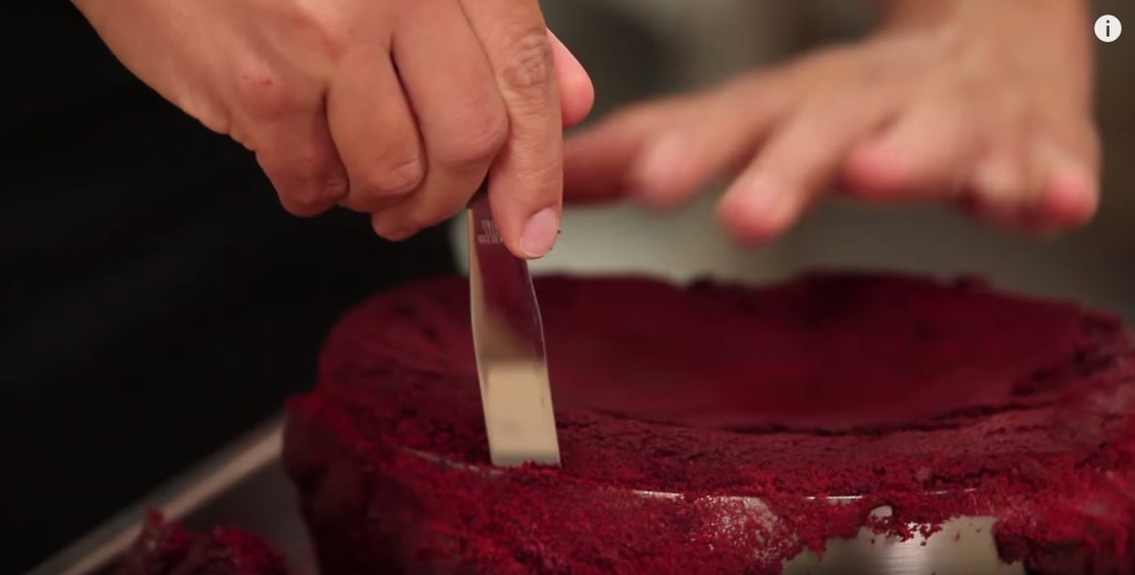 首先,主持人先把烘焙好的紅絲絨蛋糕拿出來,用刀子讓蛋糕與烤碗分離…