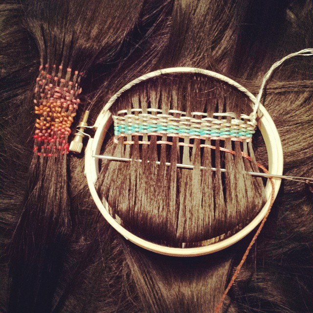 照片中圓圓的就是刺繡環啦~先將頭髮框住固定後,再透過長長的鈍針編織就完成囉!