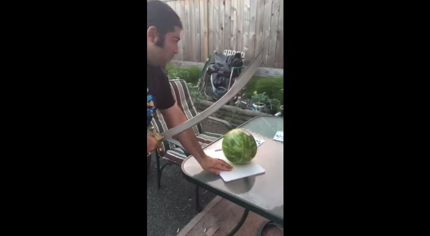 這名男子可能是因為懶得去拿西瓜刀,直接拿手邊的彎刀切西瓜…(等等,又不是武林高手,手邊怎麼會正好有一把彎刀?!)