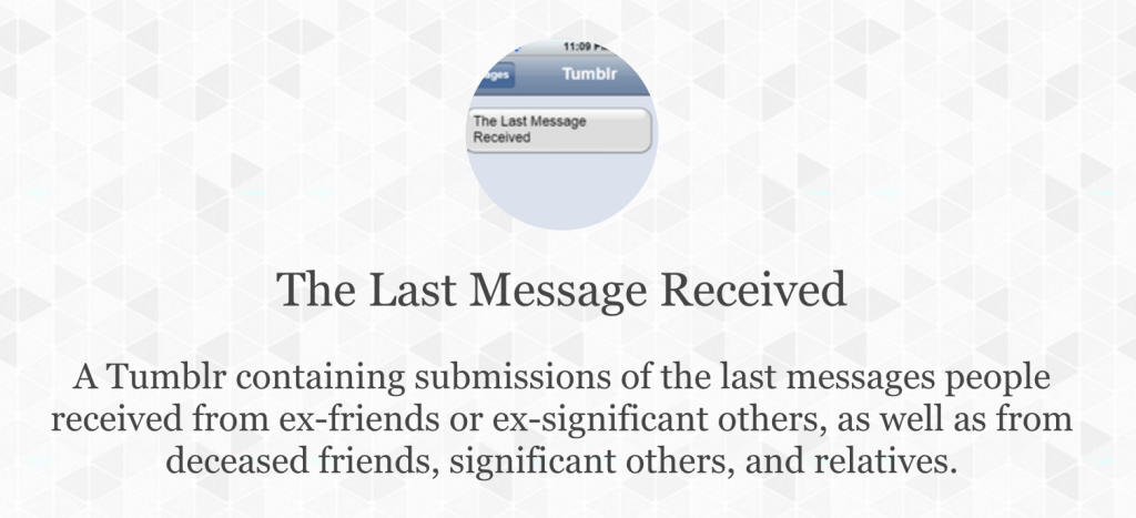 忽然要大家想像身旁的人忽然去世可能會很奇怪,但是其實我們都不知道人何時會走,也不知道我們剛剛跟他們說的話是不是就是最後一句話。一位15歲的網友出於好奇心在Tumblr開啟了一個專門給大家投稿收到來自於別人的「最後一封訊息」,當然最後一封訊息也不一定限於某人過世,也包含了情侶分手或失聯的老朋友。