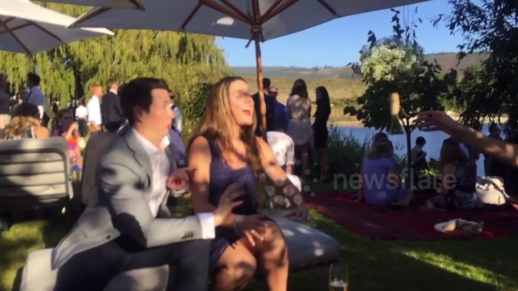 天啊!他居然飛快地直接將捧花拍掉!而且看到這位老兄後來的反應…他似乎在做出這個動作以後才覺得「天啊糟了我怎麼會這麼做」,完全說明了…有時候大腦思考的速度還是比不過內心真正的想法所呈現的直覺反應啊!(表示他根本不想娶她的意思嗎…?)