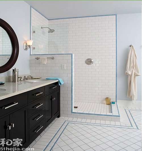 衛浴間牆面選擇了淺淡的藍色,配合藍色瓷磚線條得體。淋浴房多鋪瓷磚,因此選擇了跟地面一直的白色塊磚來做拚接,只不過跟地面比起來,牆面拚接彷彿略有變化,也讓整個空間更富視覺感。藍色瓷磚做為線條點綴,改變了室內單調的效果,更是將淋浴區跟其他空間劃分開來,整體設計十分巧妙。