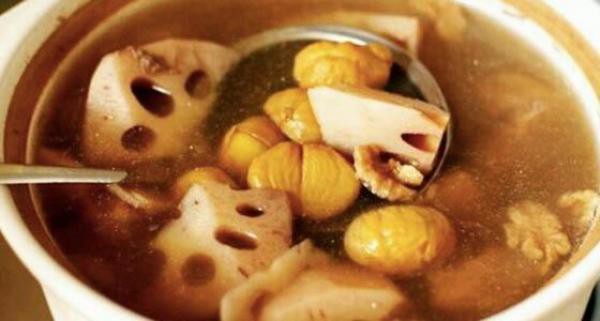 材料:大薏仁2兩,腐竹2張,銀杏10粒,玉米2條,紅蘿蔔1條,陳皮一片 做法:將所有材料洗凈,大薏仁泡水兩小時備用紅蘿蔔削去外皮,切成大塊,玉米也切成大段在鍋中放入8分滿的水,放入陳皮,待水煮開後,放入所有材料,大火煮20分鐘,再轉小火煮2小時即可 一般女孩子比男孩子更容易有水腫問題,因為身體構造關係,尿道炎情況也比男孩子重,而薏仁水就是幫助身體排水的最佳利器。這道湯水可以健脾胃,利水清肺,很適合夏天用。 3:核桃栗子蓮藕湯—–補腎固腎,補血益氣