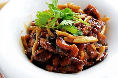 主料:湘西臘肉200g 蘿蔔乾80g 蒜瓣2個 輔料:油適量 白糖1湯匙 小米椒3個 清水適量 做法 1.臘肉用清水浸泡15分鐘左右,用刷子刷乾淨表面煙燻過的黑色,蘿蔔乾同時浸泡片刻; 2.燒開適量水,放入洗凈的臘肉大火煮20分鐘左右; 3.煮肉的時候洗凈辣椒切絲、蒜瓣去皮拍碎; 4.煮過水的臘肉撈起沖洗一下,切薄片; 5.放入蒸鍋內蒸20分鐘後取出; 6.燒熱油鍋,下蒜蓉爆香; 7.倒入蘿蔔乾煸炒片刻; 8.加上適量清水,遮上鍋蓋燜煮10分鐘左右; 9. 調入辣椒絲; 10. 倒入蒸好的臘肉; 11.調入白糖中和一下鹹味,翻炒均勻,鏟起即可。 【炒素黃鱔絲】▼