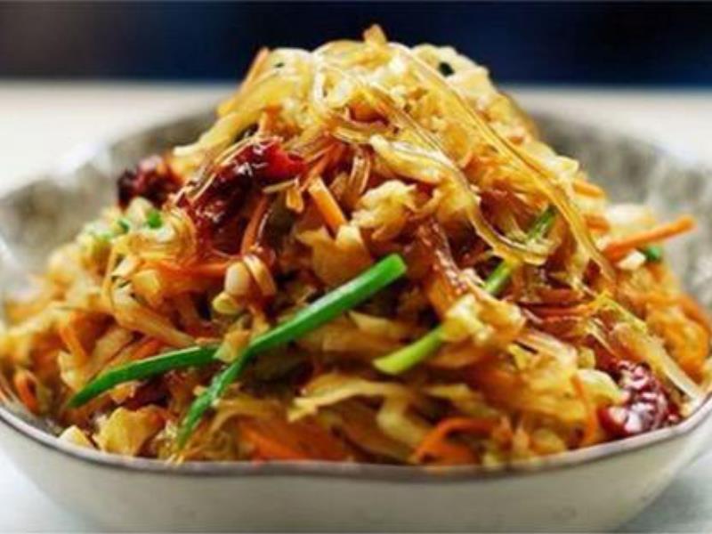2、粉條提前泡軟。  3、起鍋坐油,油熱後下蔥薑蒜末,爆至微微發黃,喜歡辣的可以同時下幹辣椒段。  4、加入醬油,開大火,稍煮,聞到濃鬱的醬香味。  5、下洋白菜和胡蘿蔔絲,再加少許蒸魚豉油,炒勻,並且菜稍變軟。  6、下粉條炒勻。  7、加熱水至菜的二分之壹處,加蓋稍煮。