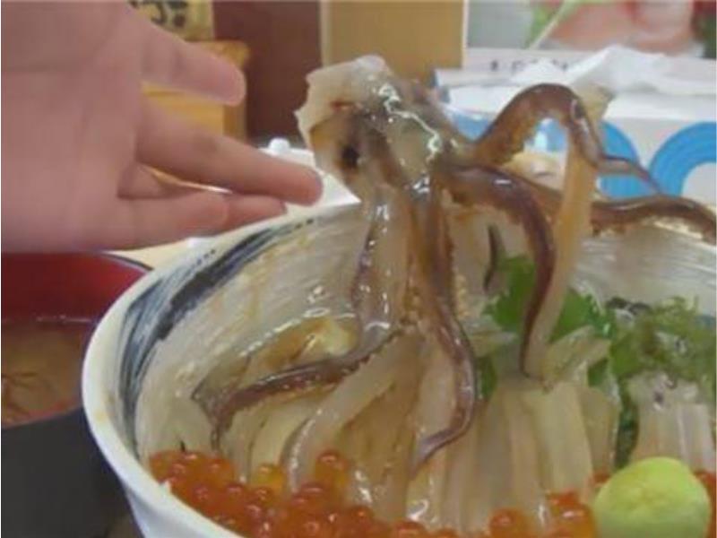 我們都喜歡吃一些海鮮,因為它們鮮嫩爽口,真是人間美味。 當然很多人都看到過這樣的場景,當我們將新鮮的魷魚須放在烤架上時會發現,它們的須竟然會動...... 這樣的情況不止只會發生在魷魚身上,很多海鮮都會。 但是當你真正看見它們從碗裡爬出來的時候你還敢吃下它們嗎? 有這樣一位女網友到日本遊玩,她點了一道當地著名的烏賊飯,可是當它將醬油淋在烏賊上時,她整個人都被嚇到了...... 烏賊飯被端上了飯桌,可以看見烏賊須下面是吃起來QQ的白米飯,上面鋪上新鮮的烏賊頭切成的細絲,細絲周圍是新鮮飽滿的鮭魚子,看著就好有食慾。 開吃之前該女網友按照指點準備將醬油淋在烏賊的身上。 可是沒想到的是,烏賊居然復活了! 它不停地擺動著觸鬚,一直掙紮著。  當醬油將烏賊淋遍時,它十分「激動」,觸鬚不住向外探索,想要逃出碗裡。