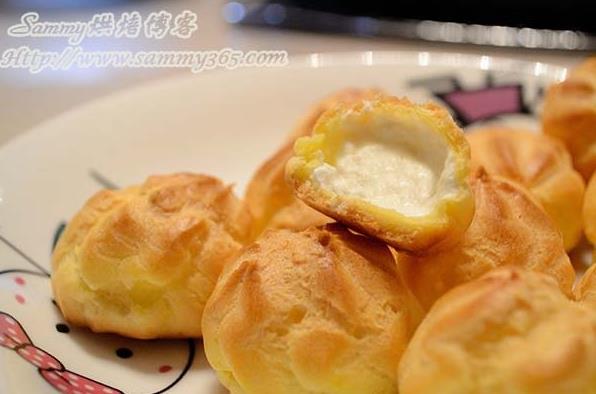 2. 泡芙膨脹原理:大家通過配方就可以知道,製作泡芙皮時的水份很多,這樣在烘焙的時候由於加熱,水份會變成水蒸氣,它會在泡芙內形成氣壓,而外面包裹的澱粉則包住了裡面的氣體,這樣泡芙就像氣球一樣膨脹起來了。