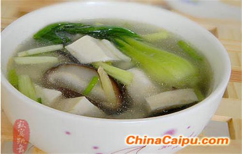 做法: 1.豬肉洗乾淨切片,煮開 2.把水煮滾,放入鮮香菇、生薑、豆腐,用大火煮十分鐘,再轉至中小火煮至香菇熟透 3.放入豬肉片,待肉片熟透後,加入鹽或鮮味露調味即可 功效:清熱解毒、降低血脂、潤澤肌膚、降低血壓 雜菜雞腿湯 材料:去皮雞腿、香菇、草菇、生薑、紅蘿蔔、玉米、玉米須(中藥店有賣)、芹菜、綠花椰菜