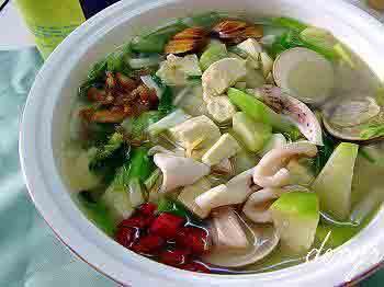 瓠瓜和葫蘆瓜對機體的生長發育和維持機體的生理功能均有一定的作用,但與其他蔬菜相比,其營養價值較低。不過它們都含有一種幹攏素的誘生劑,可刺激機體產生幹攏素,提高機體的免疫能力,發揮抗病毒和腫瘤和作用。因此,瓠瓜和葫蘆瓜一樣,宜於一般人食用。 葫蘆海鮮湯原料:花蛤蜊、水、油、葫蘆瓜、蒜、薑、魷魚、味精、香菜、紅椒、鹽。 葫蘆海鮮湯的製作方法: 1、花蛤蜊連同涼水一塊下砂鍋(熱水下這花蛤蜊,蛤蜊不容易張口)燒至蛤蜊開口; 2、另起油鍋,炒少許花肉,肉渣出鍋後另存待用,然後把蒜薑在油鍋內爆香,下入葫蘆瓜翻炒; 3、炒至瓜片變色並且稍稍變軟,倒入翻滾的砂鍋內; 4、開鍋後下入魷魚條; 5、再次燒開後,加適量鹽和味精,香菜蔥段,油渣和切碎的紅椒 了解更多海鮮湯做法.