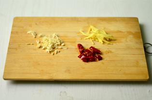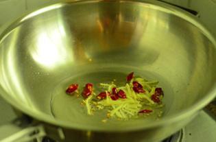 5、鍋裏熱油,爆香薑絲和幹辣椒