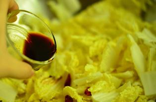 7、調入醬汁,炒至白菜發軟後放蒜蓉