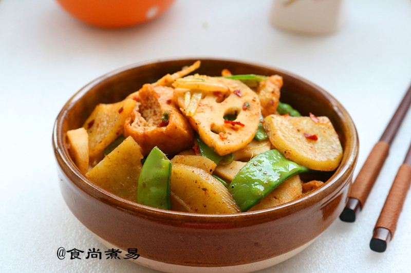 食材:蓮藕100克 土豆100克 荷蘭豆100克 芹菜1根 油適量 鹽2克 麻辣香鍋調料10克 清水少許 雞粉少許 豆腐泡4個。 做法: