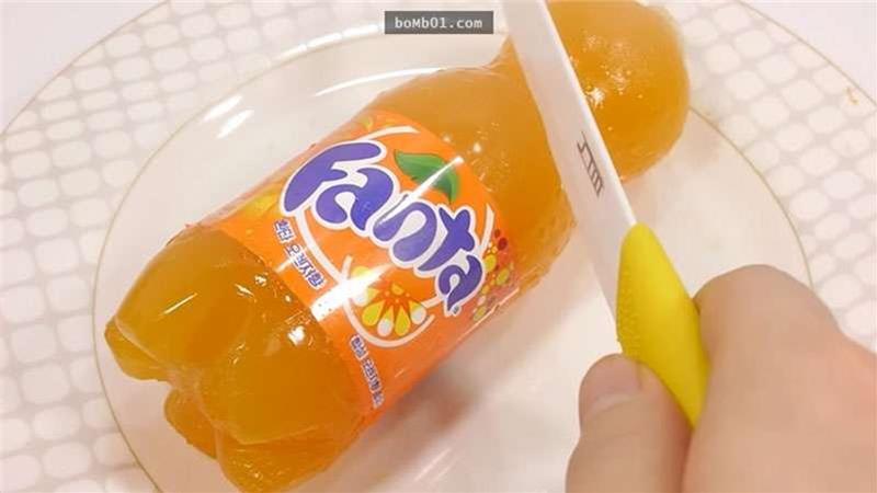 ▼將汽水與明膠混合物加熱,攪拌均勻,去掉泡沫,然後倒入汽水瓶中。  ▼將汽水瓶放進冰箱中,待混合物凝固再取出。去掉汽水瓶,完美的芬達果凍就出現了。   ▼這就是製作過程。 朋友聚會時,將這樣的甜點擺上桌,一定會收獲很多讚美。