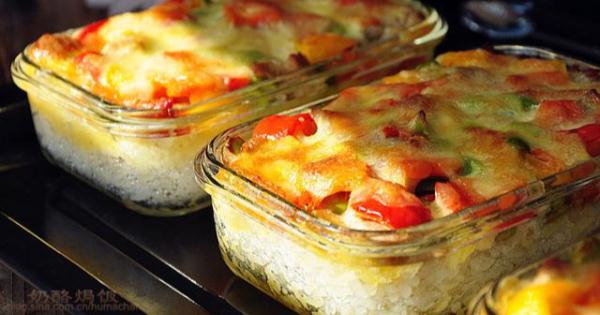 3.米飯裝入耐高溫容器的最底層,按壓均勻,上面鋪一層土豆泥,再放一層炒熟的菜,最後撒一層馬蘇裏拉乳酪即可。
