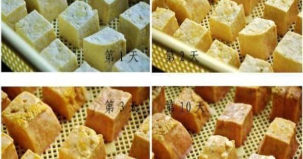 第十天:豆腐完全變成了黃紅色,濃稠的黃汁包裹著豆腐,豆腐看上去也比較溫軟,並且散發出一種特殊的黴豆香氣。此時可以用根筷子擢擢,試探下豆腐中心是否軟綿又緊實,若是,即可停止發黴,以免繼續黴下去,豆腐會腐爛不成型。(這個也要看個人口味,有的人喜歡黴豆腐硬,有人喜歡黴豆腐軟,完全可以按個人癖性來選擇黴豆腐黴製時間的長短。)