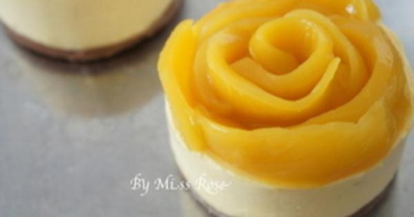 用噴火槍或吹風機加熱慕斯圈的邊緣後脫模,表面再用新鮮芒果片排成玫瑰狀裝飾
