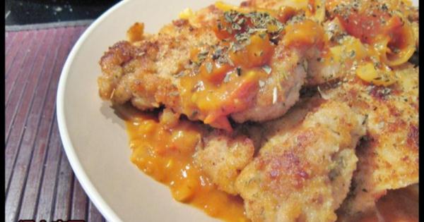 先雞扒用醃料醃5分鐘, 再平均順序沾上粟粉, 蛋漿, 和面包糠, 小心放於碟上, 雪15分鐘 再快火油(約1湯匙)起鑊, 先加入洋蔥和1茶匙鹽炒至軟身, 再加入蕃茄和1茶匙糖略炒, 再加汁料攪勻煮滾(圖2), 淋上雞扒即可