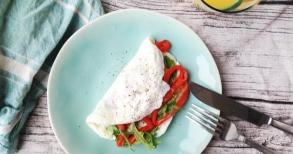 再加上芝麻菜和紅甜椒,將圓型蛋皮對折,Omelette的表面上再佐以少量的鹽和胡椒粉,90 卡路裏的Omelette早餐就完成了!