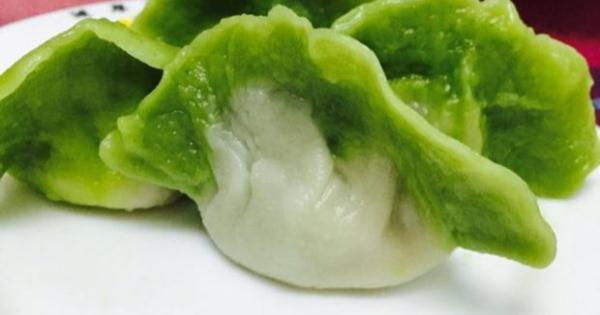餡兒拌好,白面揉條,菠菜汁面擀片。把白面包進菠菜汁面片中。