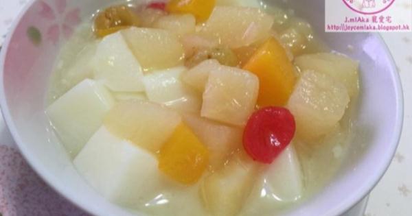 7. 雪至凝固後脫模,切粒狀備用,配合適量雜果和糖水食用。
