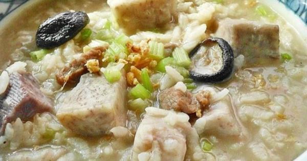 3.起油鍋先爆香香菇後,再爆香蝦米和肉絲~香氣釋出後..加入1匙的醬油炒香~ 4.接著馬上倒入適量的高湯..煮開後加入米飯(約3~4碗)和炸好的芋頭。 5.米飯依個人喜好煮至適當軟糊程度後加鹽.白胡椒粉調味~拌均勻。