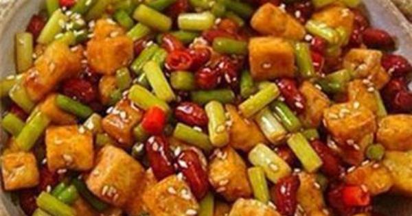 材料:豆腐、紅皮花生米、蒜苔、紫天椒、芝麻、糖、香醋、老抽、料酒、澱粉