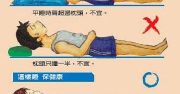 ★—建議,平睡(仰姿)時,枕頭要剛好從整個頭部一直墊到脖子,不能墊到肩膀,更不能只墊到後腦一半之處,膝下最好安置一個小枕頭;側睡時高度要加高一倍,兩膝間也要夾個小枕頭;