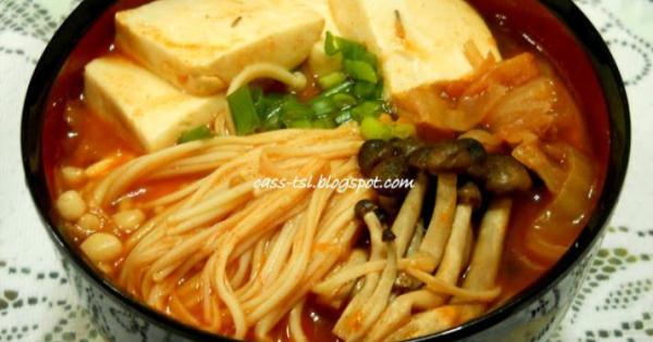 把水放入鍋裡煮滾,加入泡菜,泡菜汁和洋蔥片,以中小火煮約20分鐘或泡菜變軟。加入韓式辣椒醬拌均勻,再加入冬粉,最後才加入豆腐,金針菇和茶樹菇煮約5分鐘,上桌前灑入青蔥碎。如不夠鹹,可加入少許鹽調味。也可加入豬或雞肉。太酸的話,可加入少許糖。