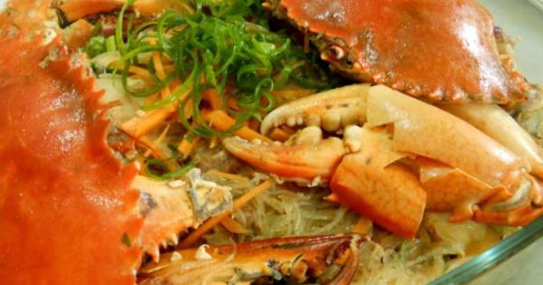 - 燒熱鍋子,把三層肉放入鍋裡爆香至出油(三層肉呈微焦),加入薑片,蒜碎,蔥白段炒香,加入螃蟹塊翻炒均勻,往鍋邊加入1/2杯花雕酒煮滾,再加入2 ~ 2 1/2 杯清水煮至螃蟹變成紅色(熟),加入魚露,醬青和胡椒粉調味,最後加入冬粉煮軟,如太幹,可再加些水進去。起鍋前,再加入芹菜,青蔥絲和紅蘿蔔絲,即可。