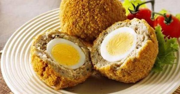 據說這是英國一間有三百年歷史的Fortnum & Mason百貨公司在1738年所發明的食物,是用新鮮的香腸肉擠出來的絞肉,中間包一個水煮的蛋,做成一個圓球外面裹上面包粉去炸過的食物。