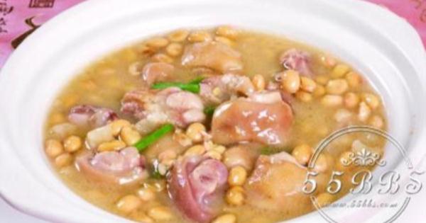 2、幹淨豬蹄加冷水大火燒開後,換中火,燉一小時到一個半小時,中間放泡好的黃豆。