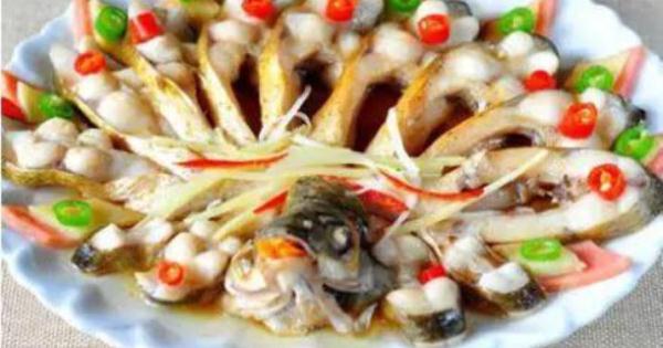 7)裝飾好,用蔥、薑絲擺在魚頭後面,燒熱油澆在上面(可以不做)。