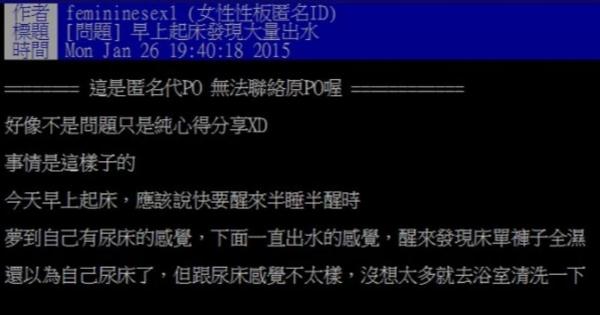 PTT某女網友在法西斯版PO文問:早上起床發現大量出水?