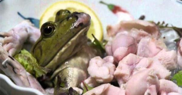 這道菜的做法是,先把青蛙殺死,把肉切丁,再連同青蛙頭一起端上盤子。這時候,青蛙的心臟可能還會跳。