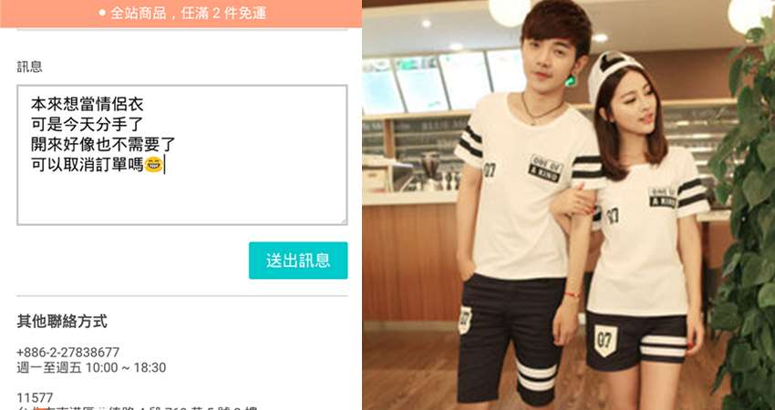 一位網友在PTT上分享,自己的朋友日前失戀了,傷心欲絕的他正在度過療傷期,努力重整心情振作起來。但就在某天忽然想到,自己曾經買了一個現在看來會很觸景傷情的情侶衣,只好一把鼻涕一把眼淚的退了訂單。