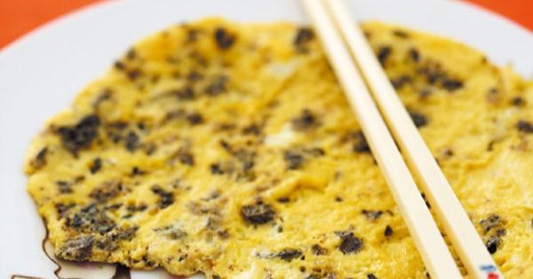 STEP2:植物油熱鍋後,將攪拌完成的艾葉蛋液放入鍋內煎煮即可。