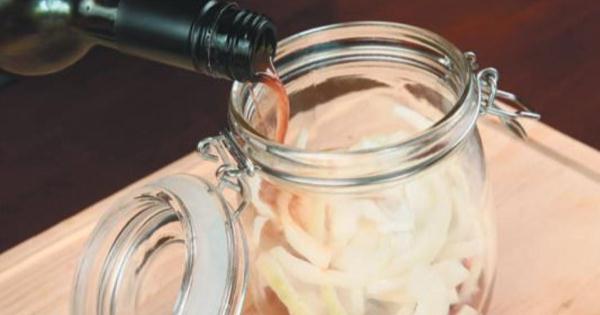 將洋蔥洗凈,去掉表將洋蔥裝入玻璃瓶內,加入紅葡萄酒,(將剝下來的外皮也一起加入效果更好