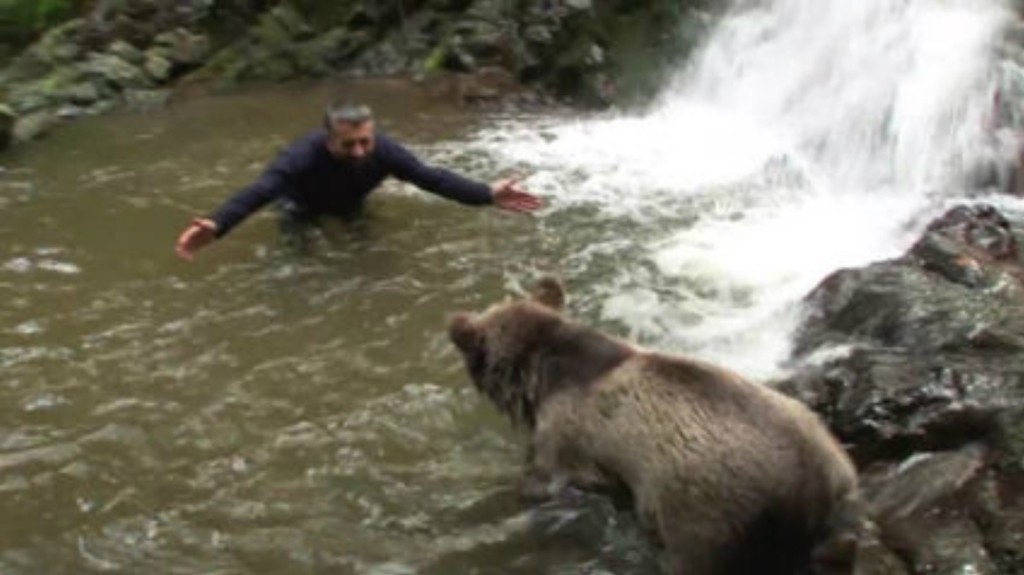 這名男子站在河裡遇到這隻熊時,他不但沒有慌張害怕、甚至展開雙臂對這隻熊做出歡迎的手勢!