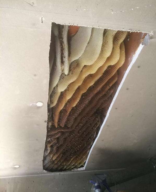 這名男子將天花板開了一個洞後,發現天花板的隔層裡面竟然有一個巨大的蜂窩。這個蜂窩大概有1米多長,半米多寬,裡面密密麻麻的擠滿了蜜蜂。看到這一幕男子嚇得腿都軟了,於是他趕快報了警,要是被這麼多蜜蜂攻擊,那後果是不堪設想的。