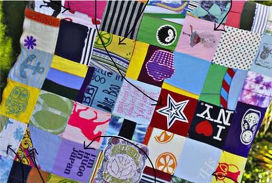 接下來正式進入這種需要搭配色彩的拚布啦,只需要將所有的舊衣服,按你預想的大小來進行裁剪,進行縫製。