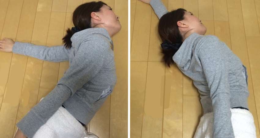 1、首先,保持側躺的姿勢,兩手打開。左手橫放著,往左側轉,脖子和肩膀保持伸展 10 秒左右。