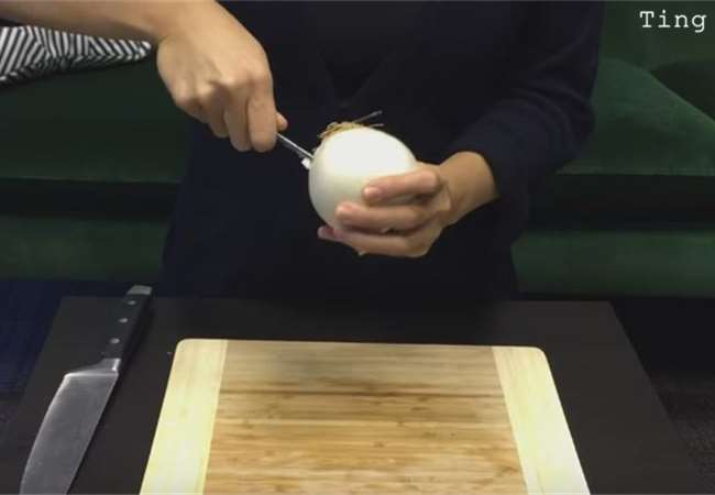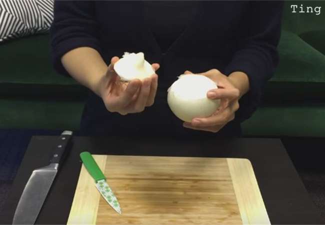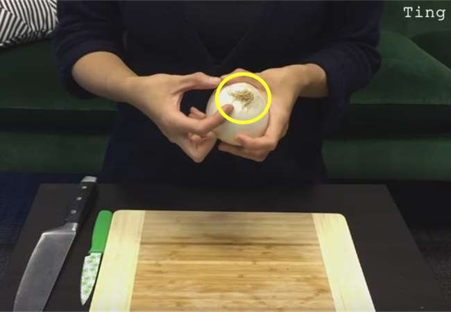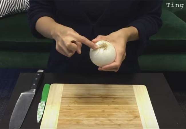 1、首先我們要找到洋蔥的「根」,因為連接根部的洋蔥心就是會讓你流眼淚的兇手!