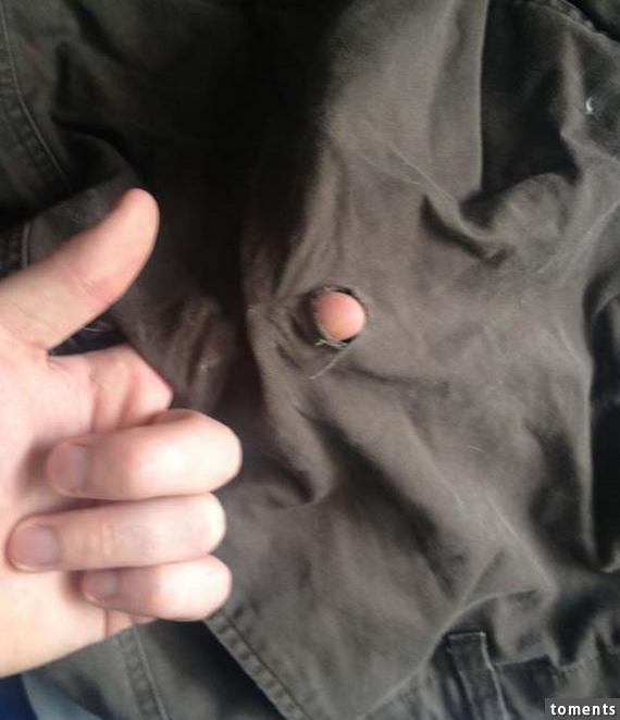 然後穿透了網友的褲子的屁屁部份。看樣子是沒法穿了。
