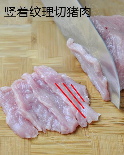 也就是說,到和肉的紋理呈水平線哦,切出來的肉片,紋路呈“川”字狀。(如果你向切牛羊肉那樣,逆著豬肉的紋理切,炒出來的肉會散碎哈)