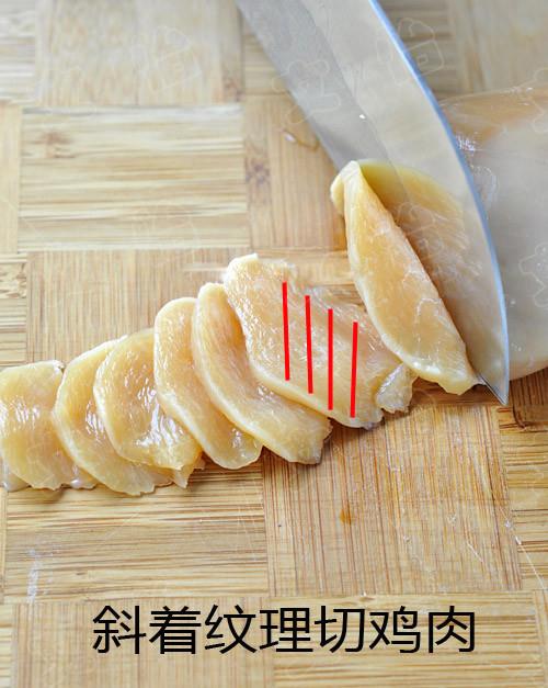 雞的肉質比較嫩,刀和肉的紋理,只要能有個傾斜的角度就可以了。切出來的肉片,紋路呈斜的“川”字狀。(切雞肉,沒有切牛羊肉和豬肉那麼多講究,差不多就行啦。